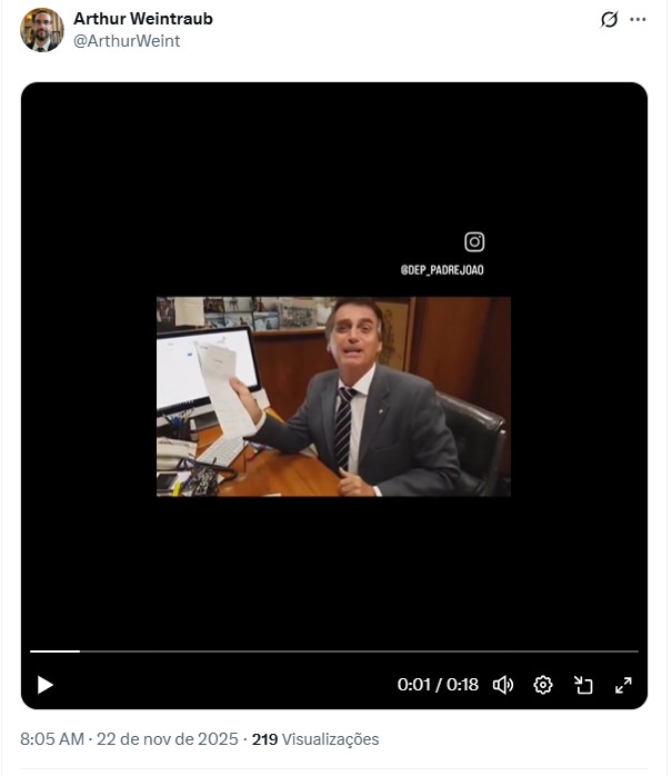 “Para qualquer espectador externo é no mínimo confuso entender a situação atual brasileira. Jair Bolsonaro não teve um julgamento justo e vem sendo privado de liberdade antes mesmo da sua condenação. Hoje, mais um golpe contra seus direitos. Um homem que não roubou um pila da população e que é o principal nome de oposição, legitimado por metade dos eleitores brasileiros!”
